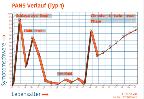 Die Leitsymptome, stets zwingend mit fulminantem oder foudroyantem (hochakutem) Beginn[12] entsprechen dem Bild einer Störung der Funktionen im Bereich der Basalganglien des Gehirns.[13][14][15] Unabdingbar für die Diagnose “PANS Syndrom” ist ein spontaner, rapider Beginn im Kindes- und Jugendalter, häufig in zeitlicher Nähe zu einer durchgemachten Infektion, sowie ein schubweiser Verlauf, der bei Chronifizierung im Erwachsenenalter eskalieren kann. Die Forschung konzentriert sich daher gegenwärtig darauf, das PANS-Syndrom möglichst beim ersten Schub so aggressiv wie nur möglich zu behandeln, da eine ursächliche Behandlung für chronifizierte Fälle, insbesondere im Erwachsenenalter, noch nicht existiert. Der grafisch dargestellte Verlaufstyp 1 zeigt einen fulminanten Beginn, einen schwankenden Verlauf in der Jugend, das typische symptomarme “Tal” im frühen Erwachsenenalter sowie die Wiederkehr der Symptomatik als langsam chronisch-fortschreitende Erkrankung im höheren Lebensalter. Typ 2 “wächst sich” gegen Ende der Pubertät “aus” und es bleiben allenfalls leichte Residualsymptome. Für exponentiell eskalierende Verläufe nach der Jugend sind in der Literatur keine Fälle beschrieben. Der Verlauf im Erwachsenenalter (Typ 1) ist mehr oder minder flach linear (langsam) ansteigend, bisweilen auch mit längeren Plateauphasen. Klinisch beobachtet, jedoch durch Studien noch in keiner Weise verifiziert, ist eine Verlangsamung der chronischen Verschlimmerung zum Seniorenalter hin, vermutlich aufgrund des im Alter weniger aktiven inerten Immunsystems.[16][17]
