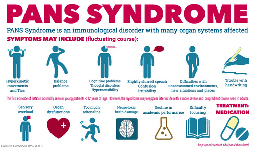 Eine Forschergruppe der Standford University, University of Buffalo und der University of South Florida erforscht das PANS-Syndrom intensiv zusammen mit dem staatlichen NIMH Institut (Vereinigte Staaten). An der Universitätsklinik der Stanford University in Kalifornien gibt es die weltweit erste Ambulanz für PANS-Patienten, welche auch Ärzte weltweit kollegial berät.[47] Es ist Stand der Forschung, dass im Fall von PANS immunologische Prozesse auf Strukturen des Gehirns (insbesondere im Bereich der Basalganglien) direkt und indirekt einwirken.[48] Als verwandter Mechanismus wird in der Forschung die "Chorea minor" angeführt, mit dem Unterschied, dass bei PANS die psychiatrischen Symptome eher dominieren.[49][50] Hinzu gesellen sich zahlreiche weitere neurologische Symptome, die unbehandelt chronifizieren, lebenslang persistieren und im Erwachsenenalter eskalieren können.[51]